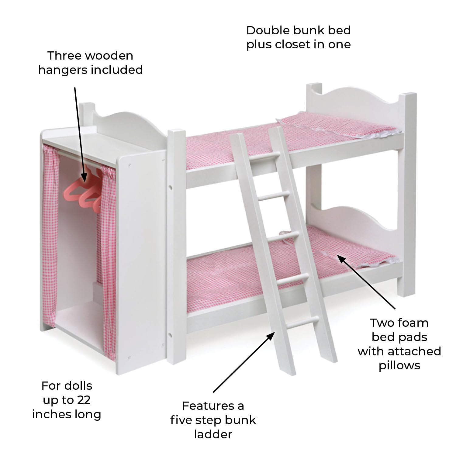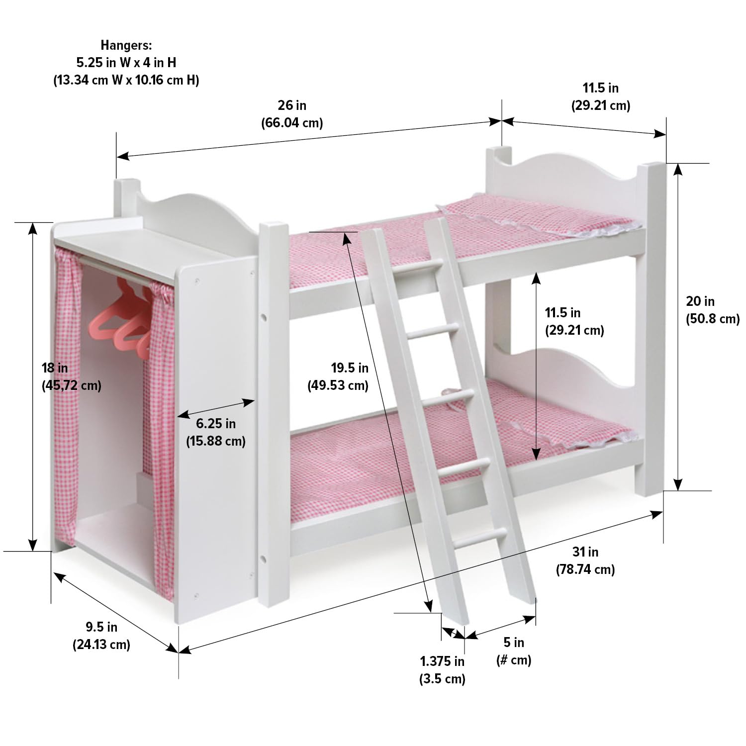 With Badger Basket’s Doll Armoire Bunk Bed with Ladder, your child can hang up her doll’s clothes at night. . . and be ready to get her dressed in the morning! This upgraded Bunk Bed features a nicely sized storage closet at one end of the bed with curtain doors to hide what’s inside. Includes a ladder for extra fun and realism. Armoire has space for hanging clothes and bottom and top shelves for shoes and accessories. Three hangers included for neatly putting away pajamas, gowns, outfits, and costumes. Soft, padded mats, with attached pillows, make the bed comfy and cozy for your dolls and stuffed animals. Armoire has a fabric back panel to keep items contained. For Dolls up to 22 inches. Fits 18 inch dolls such as American Girl, My Life As, Madame Alexander, and Our Generation; and also fits 15 inch American Girl Bitty Baby dolls and 14.5 inch American Girl WellieWishers dolls. Doll Bunk Bed is made of wood and engineered wood. Bedding is made with 100% Polyester fabric with 100% Polyester fill. Overall assembled dimensions 31 inches L x 11.5 inches W x 20 inches H. Interior length of bed is 23.25 inches. All measurements approximate. Spot clean, hand wash, and wipe clean as needed. Adult assembly required. Illustrated instructions included. For children from three years old and up. This item is to be used with dolls only and is never to be used with real infants or pets. /! WARNING: CHOKING HAZARD – Small parts. Not for children under 3 yrs. Product complies with all currently applicable safety standards. Product includes a limited warranty of 30 Days Parts to the original purchaser. Doll and doll clothes/accessories not included. Product may vary slightly from shown and described. Props/accessories shown are for illustration purposes only and are not included with the product. Actual color/finish may vary slightly from screen display. This item ships in its original carton which may include a product photo.