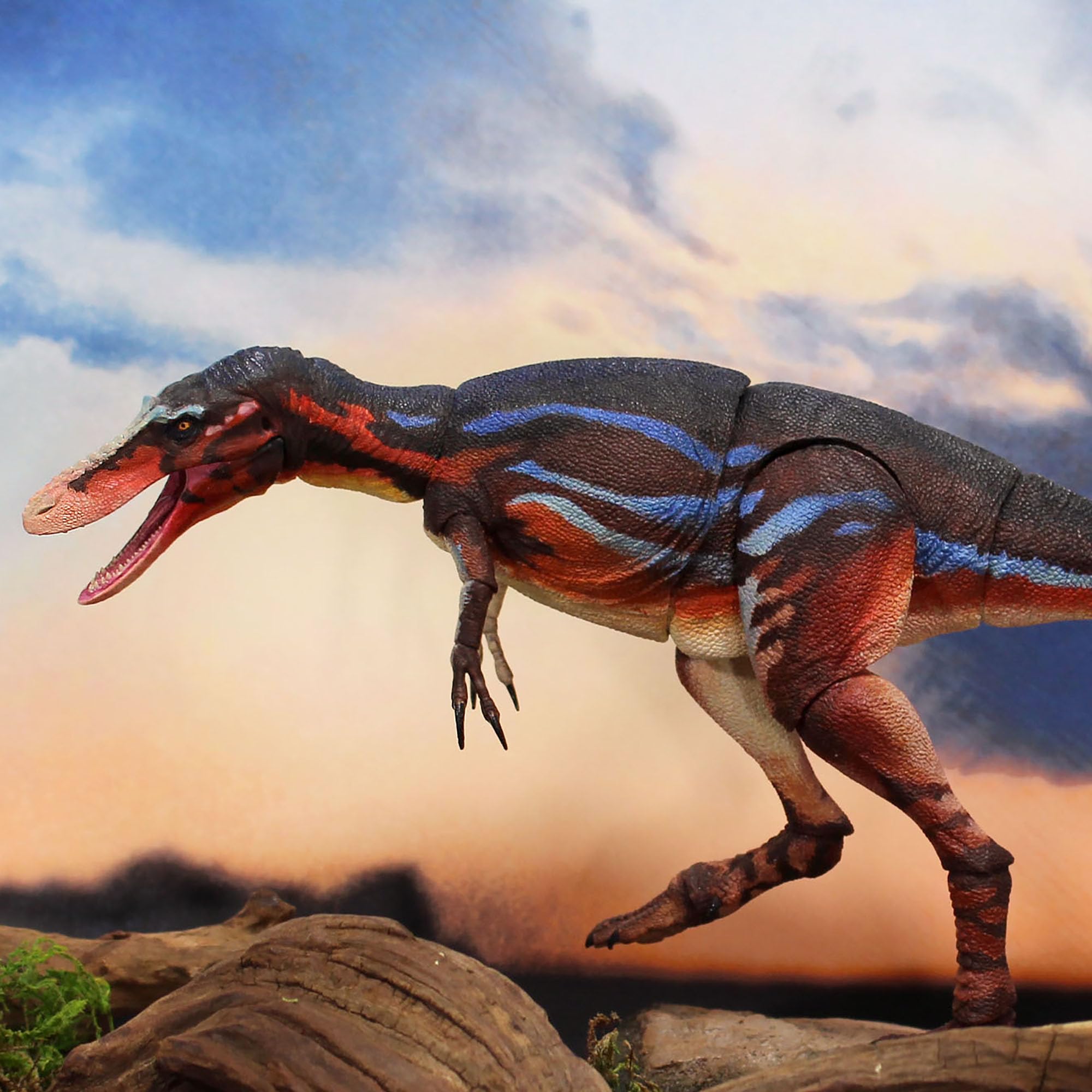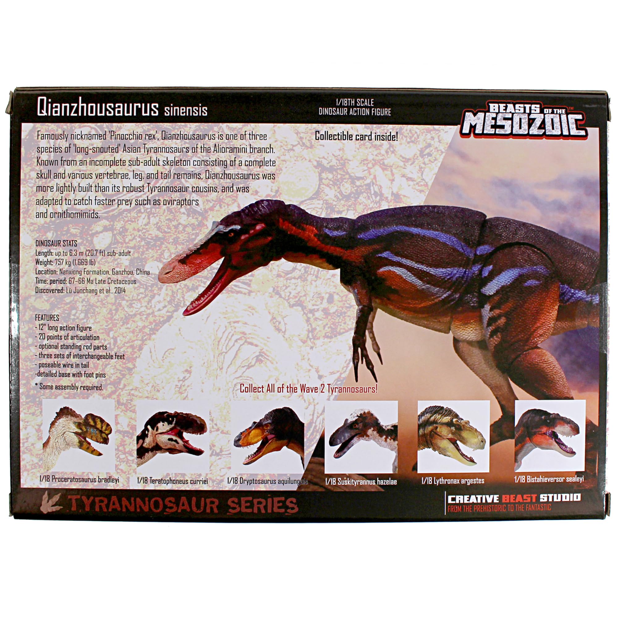 BEASTS OF THE MESOZOIC: QIANZHOUSAURUS SINENSIS – AKA (Qianzhou Lizard) – 1/18th Scale Dinosaur Action Figure. This Qianzhousaurus sinensis highly-detailed collectible figure measures 12″ long by 5.5″ in height and and features 20 points of articulation. Includes (1) 1/18th scale Qianzhousaurus sinensis action figure, interchangeable feet, bendable tail, and detailed base with posing rods. Featuring unique package art by Shannon Beaumont. DINOSAUR FACTS: Length: up to 6.3 m (20.7 ft) sub-adult. Weight:757 kg (1,669 lb). Location: Nanxiong Formation, Ganzhou, China. Time: period: 67–66 million years ago – Late Cretaceous. Named by: LüJunchang et al., 2014. Famously nicknamed ‘Pinocchio rex’, Qianzhousaurus is one of three species of ‘long-snouted’ Asian Tyrannosaurs of the Alioramini branch. Qianzhousaurus was more lightly built than its robust Tyrannosaur cousins, and was adapted to catch faster prey such as oviraptors and ornithomimids. CREATIVE BEAST STUDIO: Discover captivating and scientifically accurate dinosaur models. Our extensive collection is perfect for dinosaur enthusiasts like yourself seeking authentic and life-like collectibles. Dinosaur action figure collectibles with maximum articulation is something that we take pride in creating. We invite you to immerse yourself in a forgotten world of beauty and strong organic forms. The Beasts of the Mesozoic toy line began as a Kickstarter campaign in 2016 for the Raptor Series. There have been two more successfully funded Kickstarter campaigns for BotM since then with the Ceratopsian Series (2019) and Tyrannosaur Series (2021). Beasts of the Mesozoic is a scientifically accurate toy line celebrating prehistoric natural history in a realistic and interactive medium. Recommended for ages 15 and up (contains small parts) .
