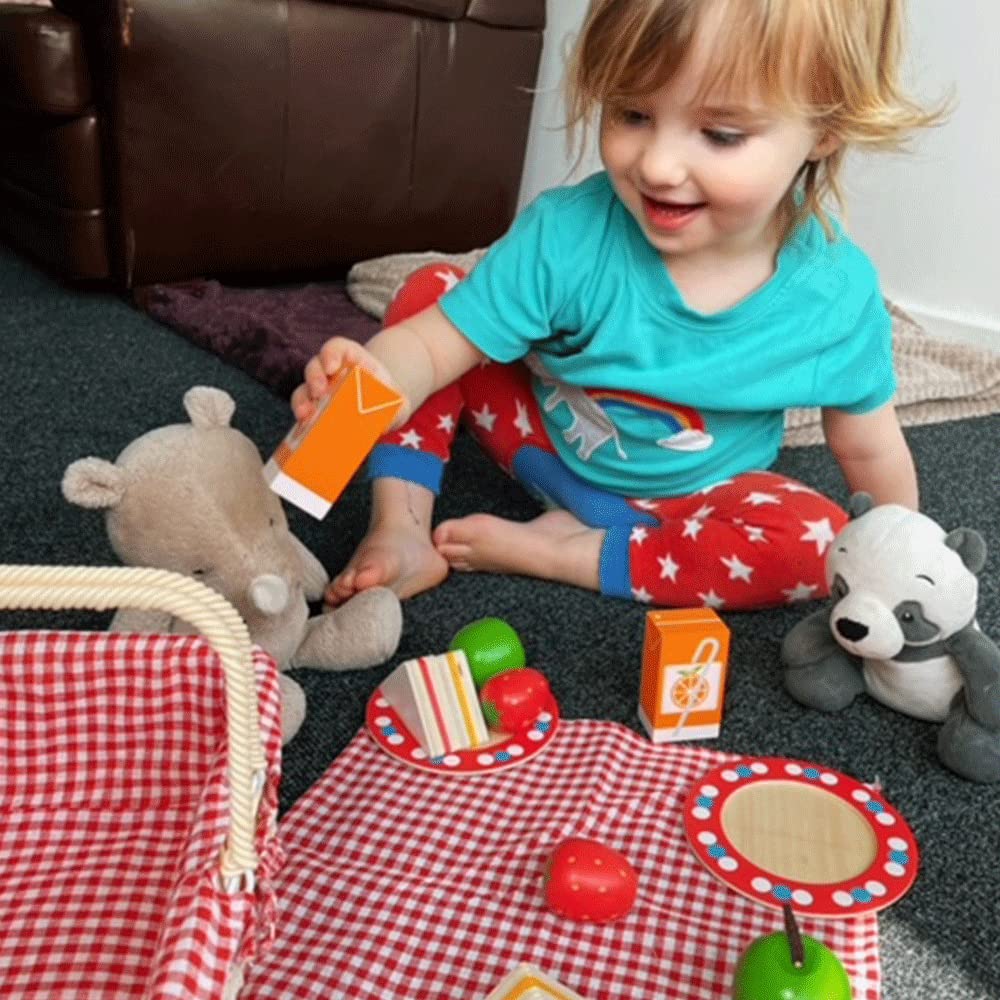 This traditional Picnic Basket comes with all the picnic essentials! Includes wooden play food such as sandwiches, strawberries, apples and cartons of orange juice. Complete with plates, a wicker picnic basket and matching picnic blanket. Picnic with your teddies, or head to the park with friends or family. Perfect for interactive play sessions. Our Picnic Basket set teaches little ones about the importance of a healthy and balanced diet. Encourages creative and imaginative roleplay. Made from high quality, responsibly sourced materials. Conforms to current European safety standards. Age 3+ years. Picnic Basket – product features: Wicker picnic basket with sandwiches, strawberries, apples, cartons of orange juice, plates and a matching picnic blanket Ideal for interactive play sessions 21cm L x 12.5cm H x 28cm W 3 years +