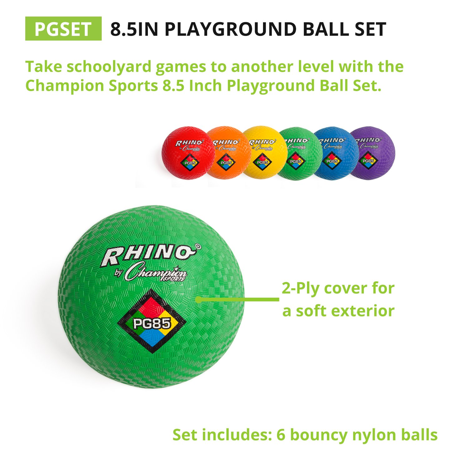 PLAYGROUND BALL 6 PACK SET Champion Sports multi-colored playground ball set. This exclusive rubber-ball set Includes 6, 8.5 inch soft nylon bouncy balls with easy grip textured surface. Playground balls are great for boys and girls playtime and classic outdoor games. Soft rubber balls are also a great pet toys perfect for fetch or fun in the water with your dog. MULTI COLORED BOUNCING BALLS Colorful playground set includes green, orange, purple, red, royal blue and yellow gym balls for hours of playground fun during gym and recess games. Long lasting and durable nylon finish is built to stand up to years of wear and tear in the gym or out on the playground. SAFE NYLON RUBBER SURFACE Gym balls are made with a soft bouncing surface and are safe for kids and adults of all ages. Soft balls safely absorb hits and bounces off the head and body ensuring safe game play and hours of fun with little risk. GREAT FOR KIDS GAMES Inflatable rubber balls are perfect for school gyms, rec centers and afterschool clubs and programs. Use for dodgeball games, kickball, foursquare, keepaway, as well as a huge array of classic kids sports and classic ball games. 8.5 inch balls are the perfect size for a wide variety of games and also make for great pool toys for water polo and pool volleyball. INDOOR AND OUTDOOR USE Weatherproof and waterproof sports equipment rubber balls are perfect for use indoors and out. Balls are ideal for use in gym classes or school field days. Affordable playground balls bulk package is great for camp organizers or school athletic and physical education directors and teachers. – 6 Rubber and Nylon Coated Playground Balls – Comes with 1, Green, Orange, Purple, Red, Royal Blue and Yellow Ball – Waterproof and Weatherproof Rubber With Easy Grip Nylon Coating.