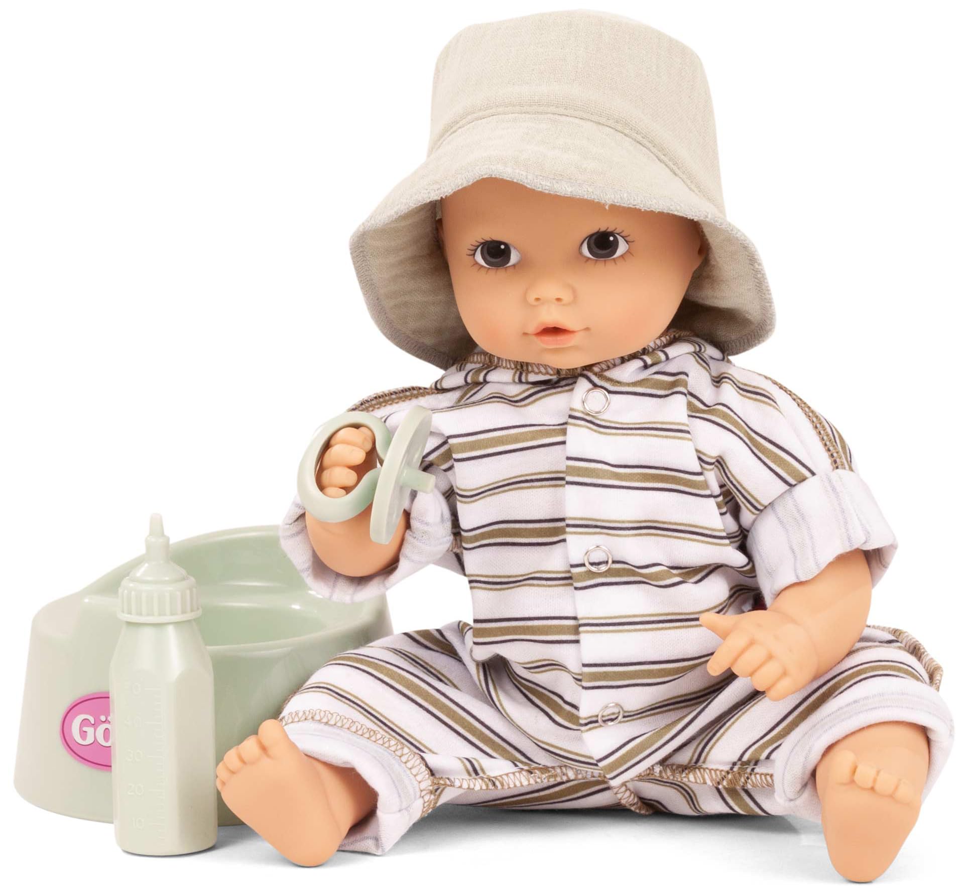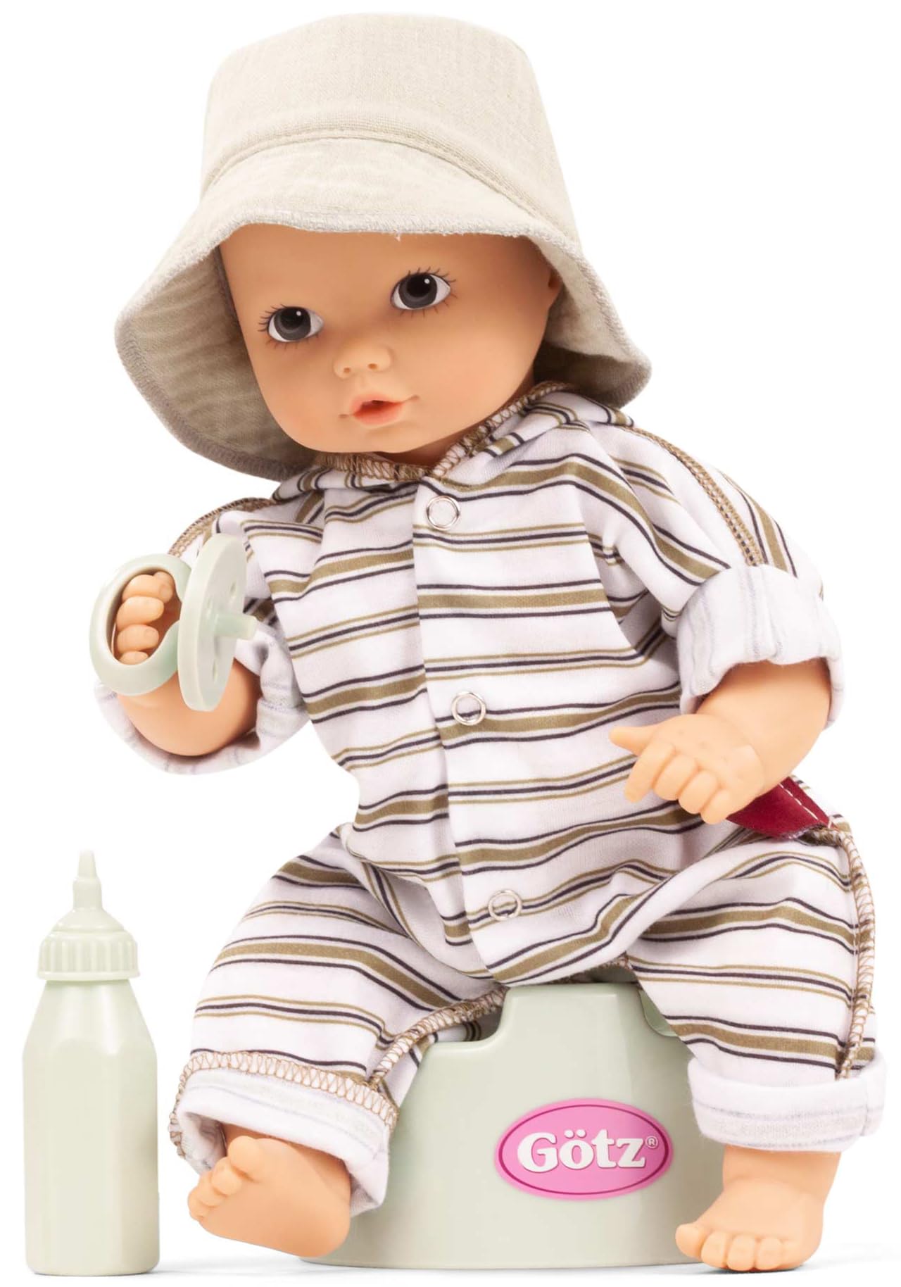 AQUINI GIRL: 13″ POTTY BABY DOLL – URBAN STRIPES – 13″ tall baby doll without hair and brown painted eyes. The little bathing mermaid has changed into her striped jumpsuit, because it’s super comfy. She is wearing her fabric hat to protect her from the sun so she can enjoy the sun. Aquini is thirsty and drinks from her bottle, just be careful and have the potty ready, because she has to go wee-wee soon. Happy and content with her pacifier in her mouth, she falls asleep straight away. This Aquini girl has brown, painted eyes. Their wearing a striped onesie with an attached hood and a matching bucket hat. Our Aquinis are anatomically correct baby dolls which can drink and use the potty. She’s a great training tool for introducing toddlers to the potty-training process. Set includes: Baby Doll, suit, hat, bottle, potty, pacifier. Gotz Aquini doll is suitable for children ages 18+ months.