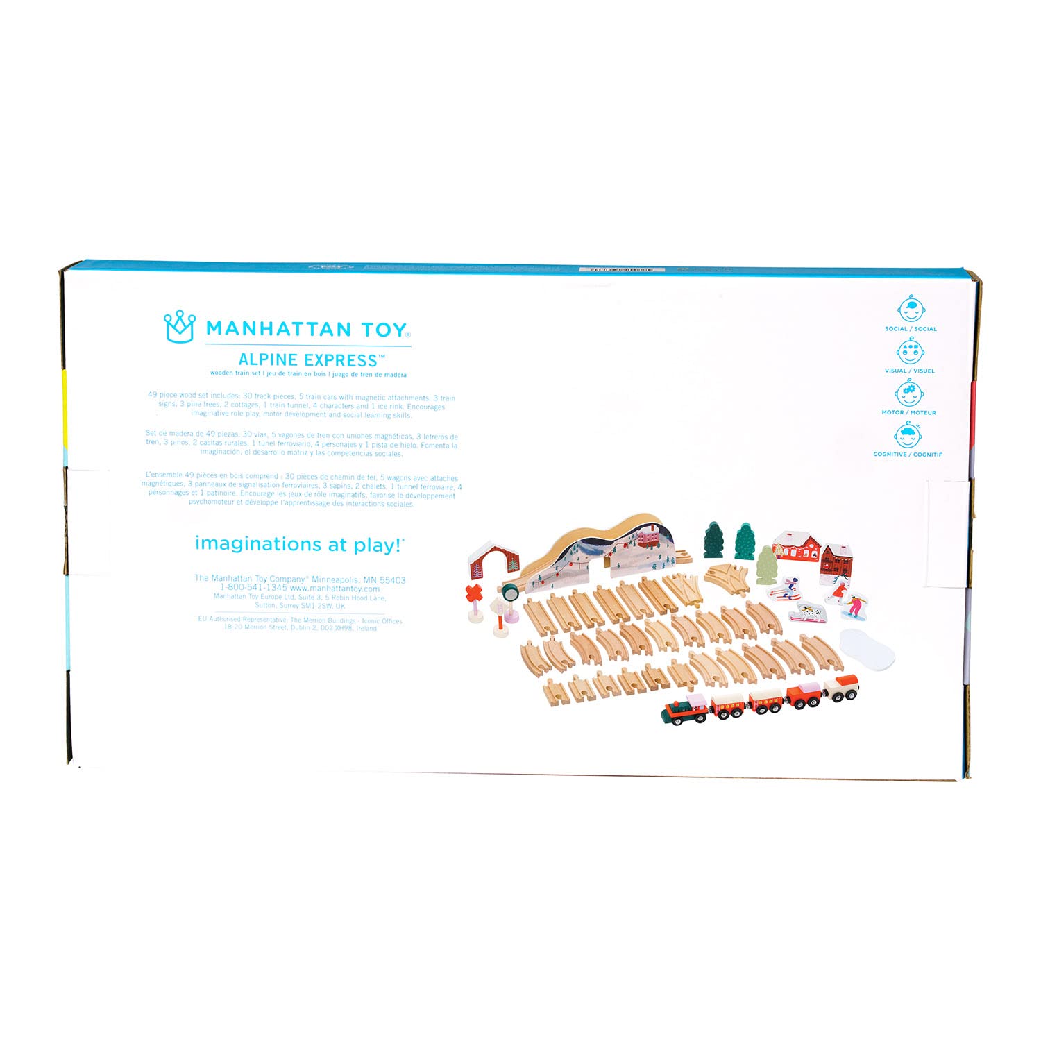 Hop aboard the Alpine Express; next stop – playtime! Pretending to operate train service to an active Swiss Alps ski resort is easy to imagine with this 49-piece wood train set that includes 30 solid wooden track pieces, 5 wooden train cars with magnetic connectors, 3 train signs and these cutout shapes: 3 pine trees, 1 train tunnel, 4 characters, and 1 ice rink. Follow the package image on track layout or create your own track that winds and weaves through endless adventures. Chug past the chalet and the friendly ice skater, under the chair lift, or through the snow-covered archway. Thrill little ones with motor skill development, cause-and-effect learning, and social skills disguised as play. Since 1978, Manhattan Toy has been making award-winning, high quality, educational toys for your baby, toddler or kid. From baby toys and toddler toys to wooden toys and activity centers, our goal is to provide the safest and best toys available.