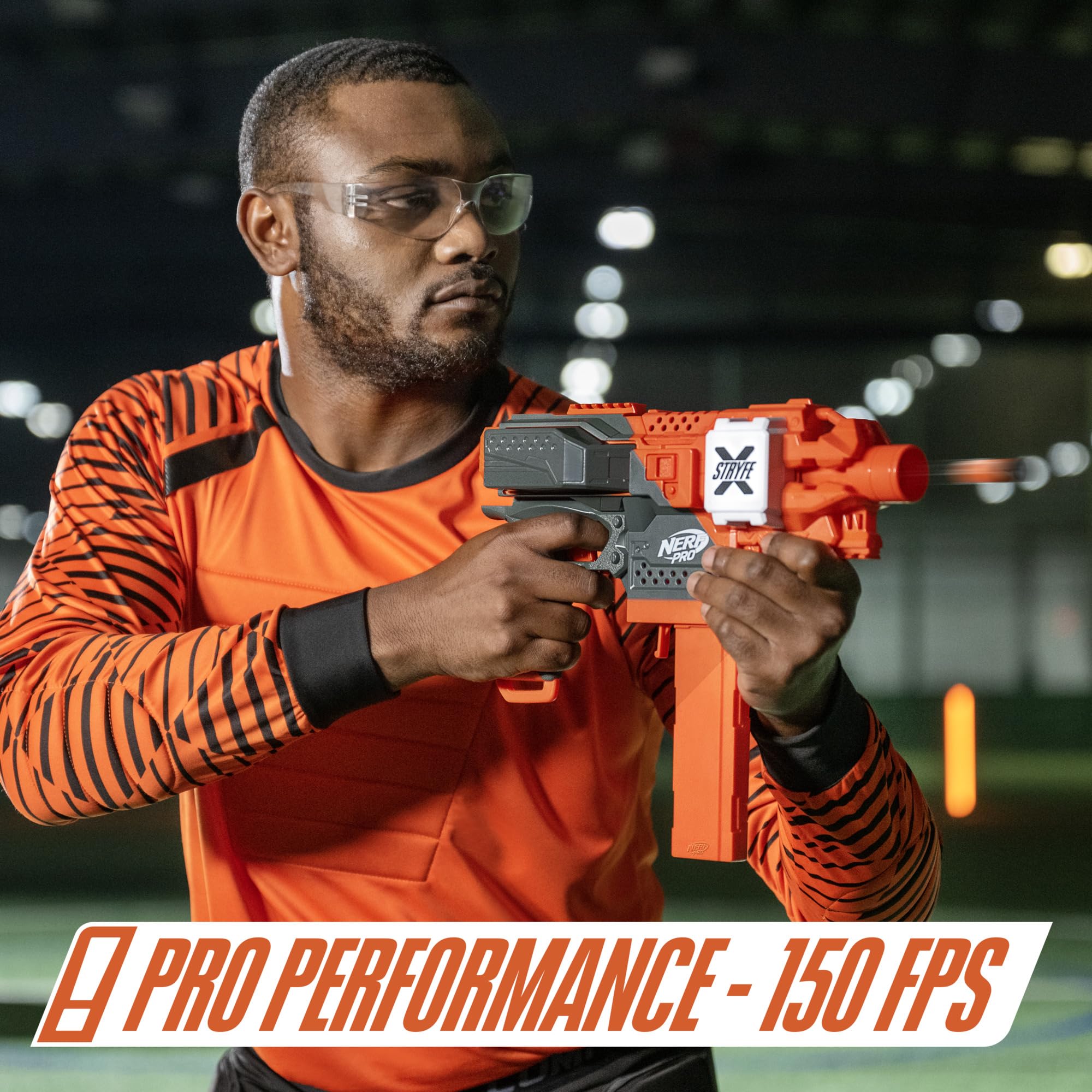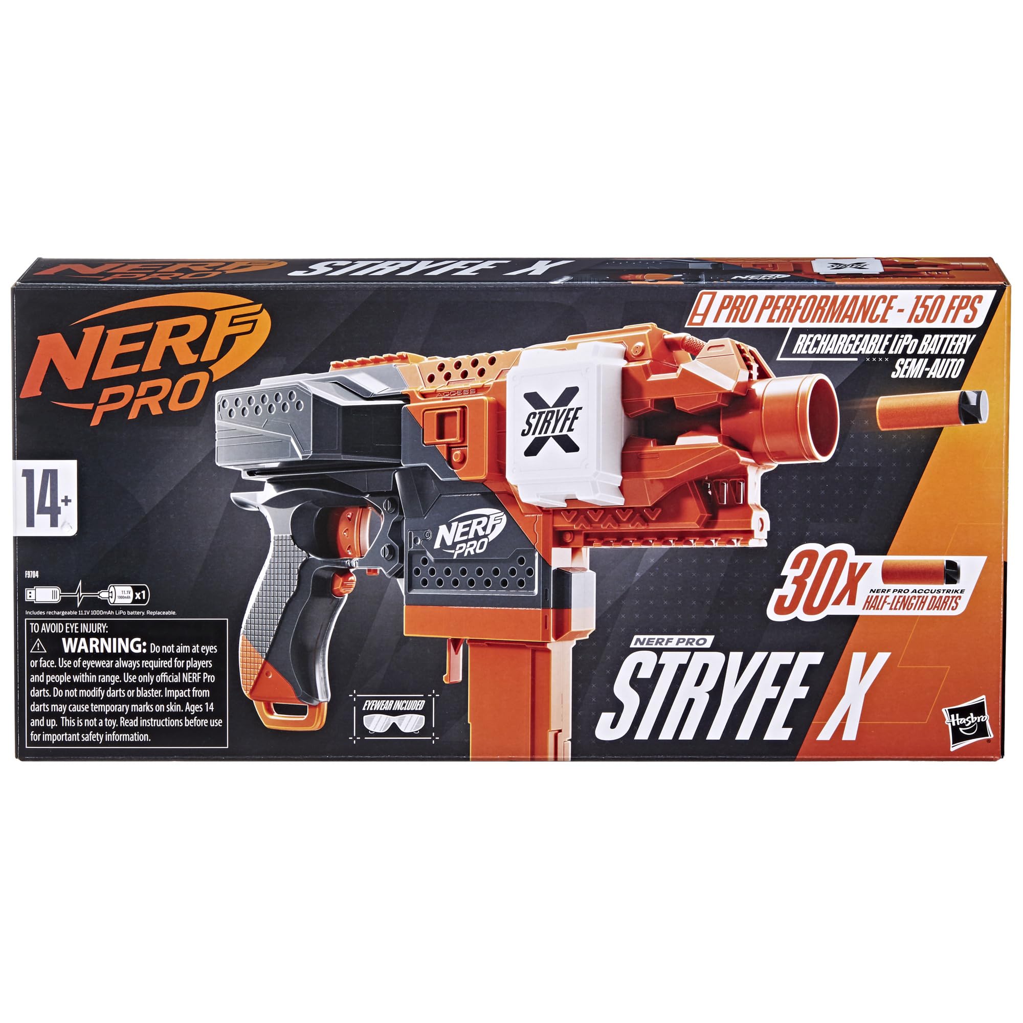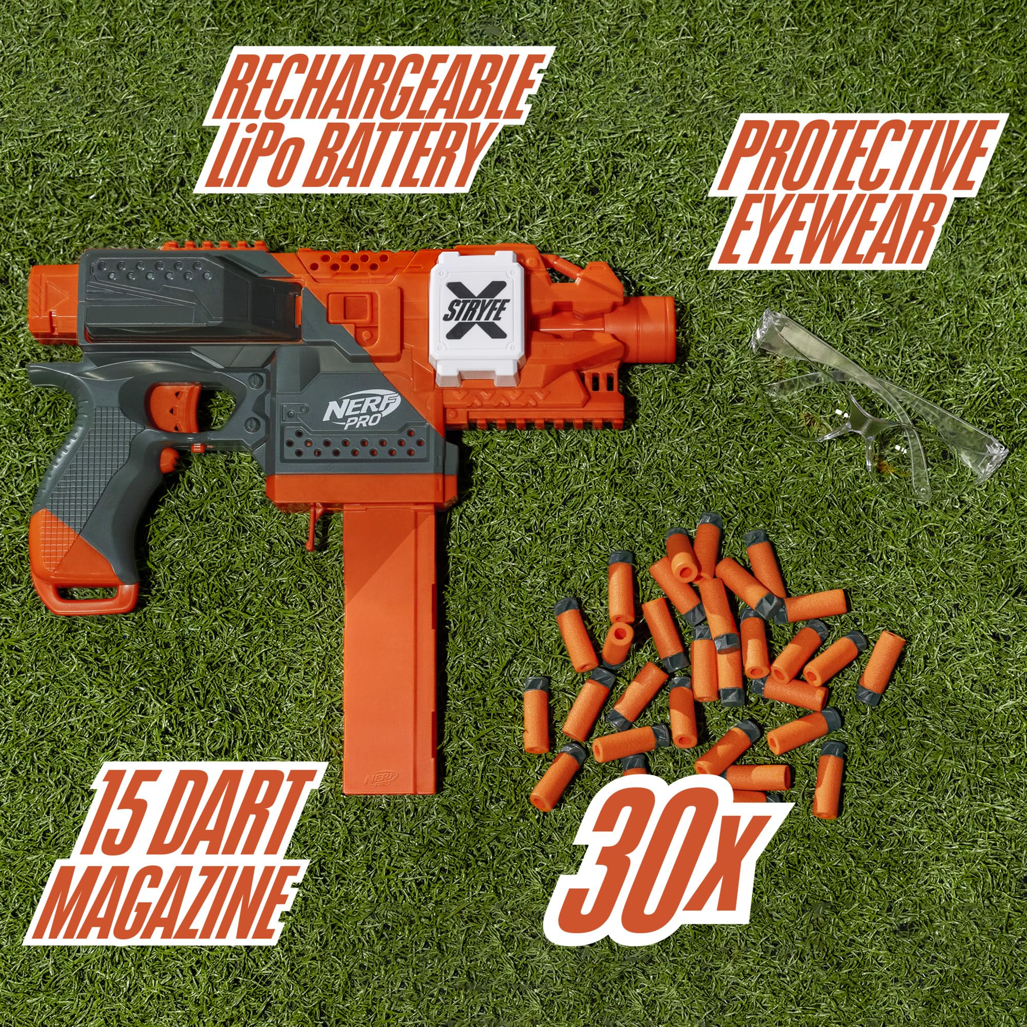 NERF Pro Stryfe X Dart Semi-Auto Blaster, Rechargeable LiPo Battery, 30 AccuStrike Half-Length Darts, 15-Dart Magazine, 150 FPS, Eyewear, 14+ (Amazon Exclusive)