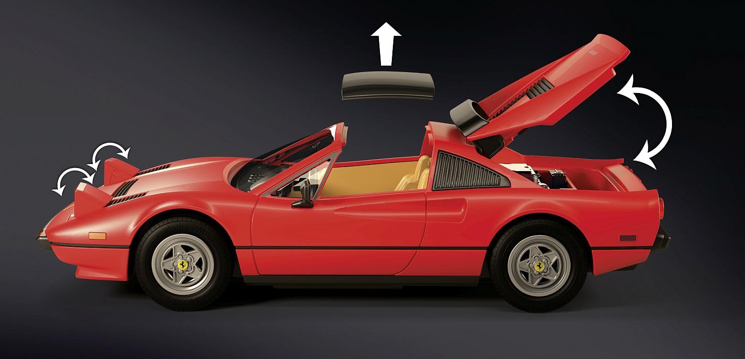 The red Ferrari 308 GTS Quattrovalvole is one of the trademarks of the 80s crime series “Magnum, P.I.”. How private detective Thomas Magnum darts across Hawaii in his red super sports car and solves exciting criminal cases, is TV history and to this day inspires fans around the world. Now the vehicle including Thomas Magnum, T.C., Rick and Higgins appears in PLAYMOBIL format with lots of great details. In addition to hinged headlights in the front and an opening hood in the rear, the Ferrari has a removable roof. Not only series fans and car collectors will be thrilled by this detailed vehicle model. “I know what you’re thinking, and you’re right!”, you simply have to have this PLAYMOBIL Ferrari! Warning. Choking Hazard. Small parts. Not for children under 3 years.