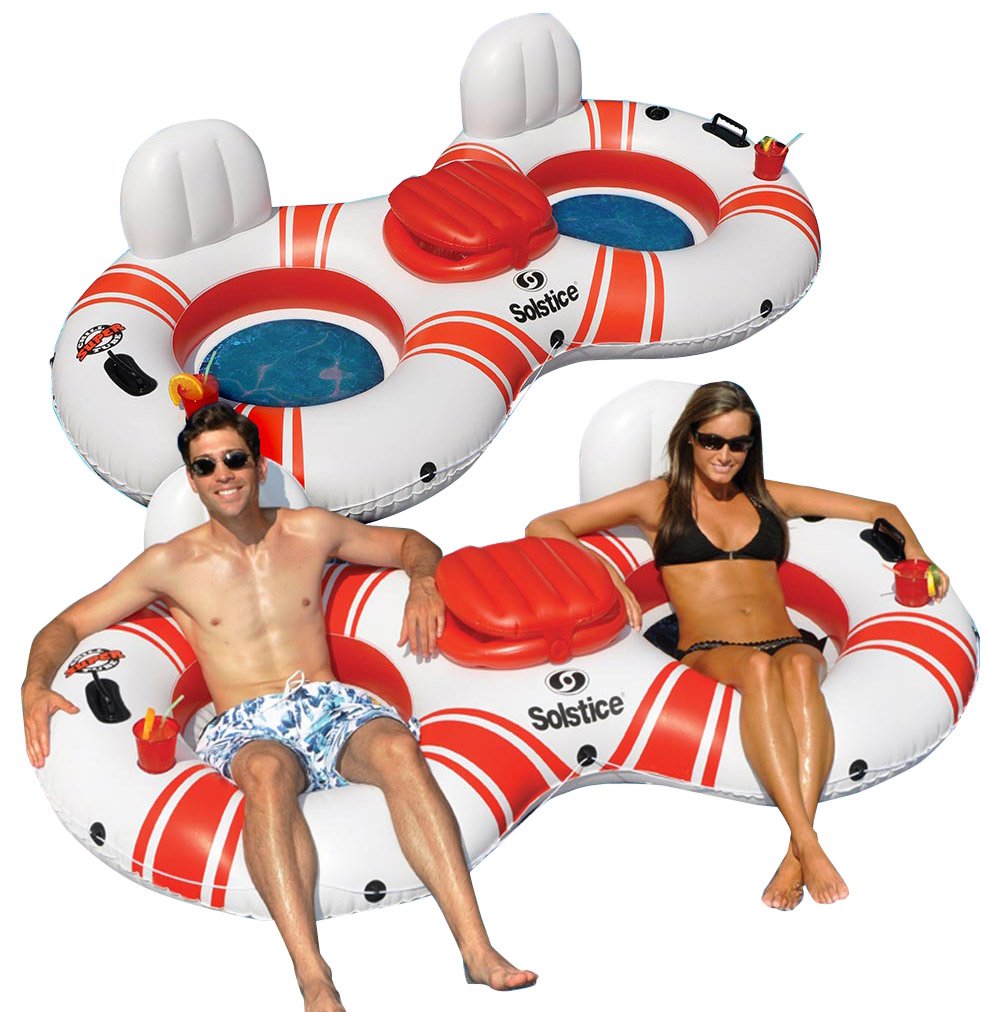 Perfect for two, this solstice Super chill tube duo pool float includes a lounging tube and drink holders with an ice chest in the center. This inflatable pool float is made of durable vinyl and comes with an all around grab line. The Boston valve system allows for quick and easy inflation and deflation. 2 pack.