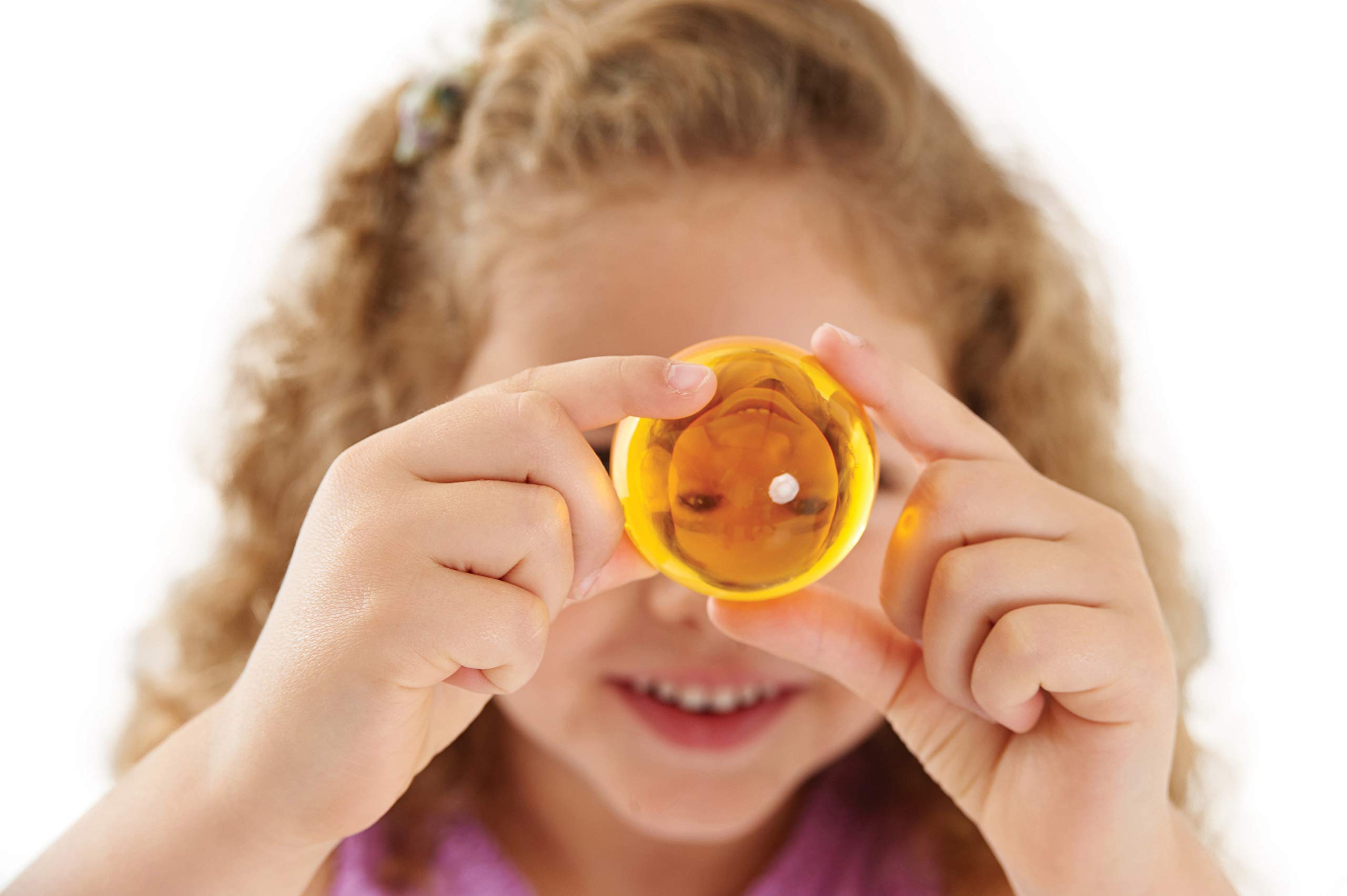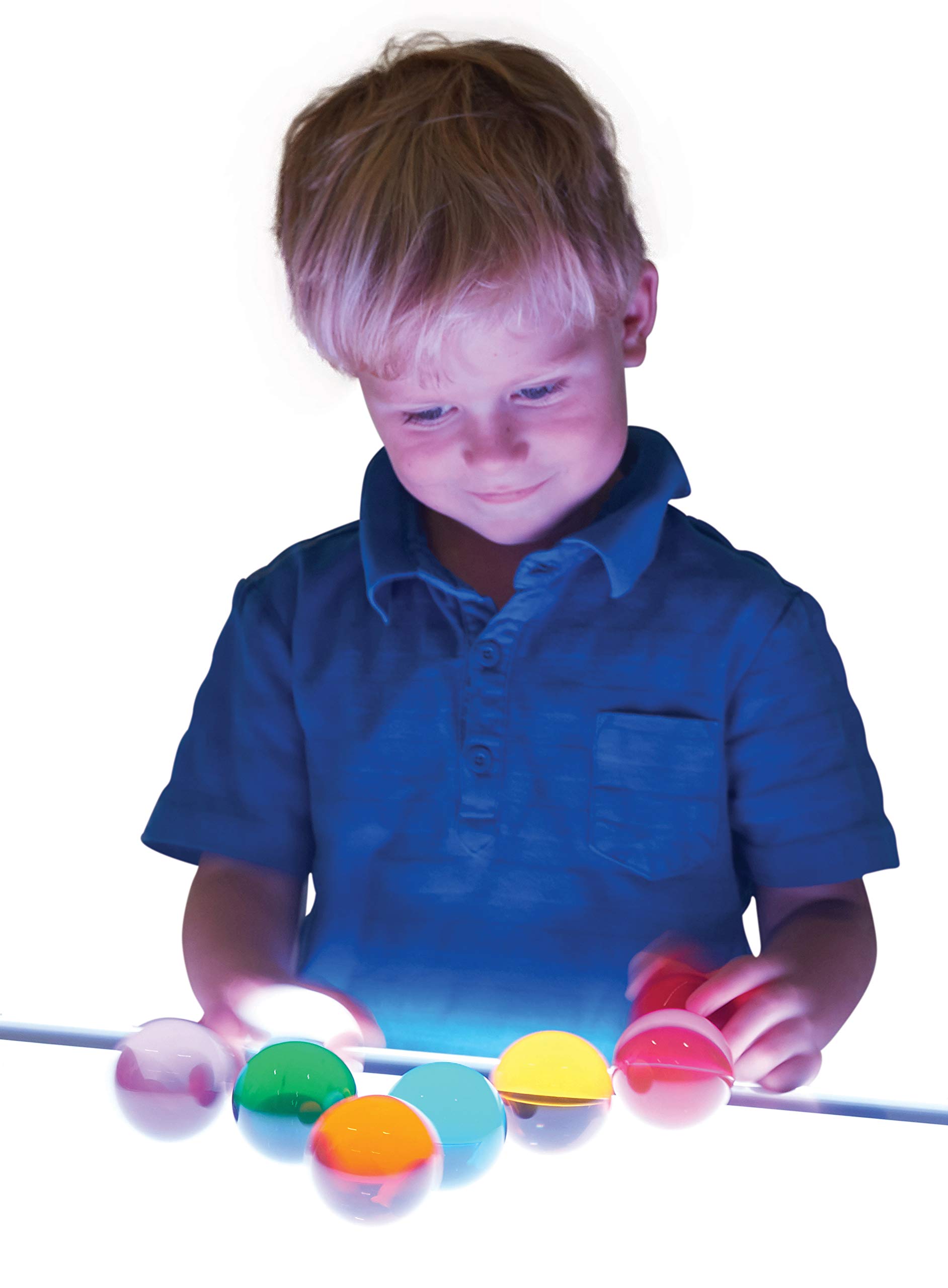 Transparent, colored acrylic spheres that feel warm and smooth to touch in 8 colors: blue, green, red, yellow, orange, purple, pink and clear. For ages 0m+.Size: 2″ dia.