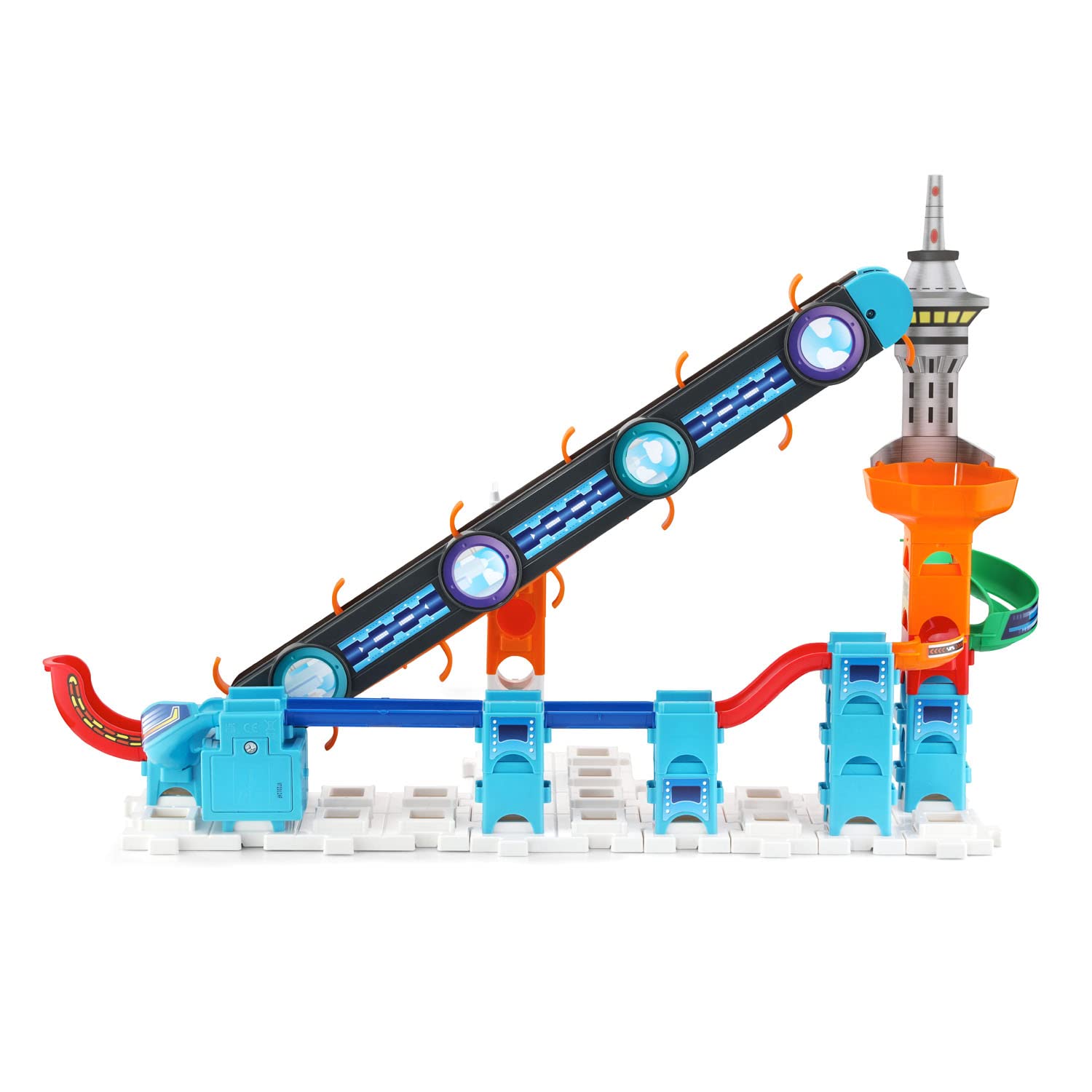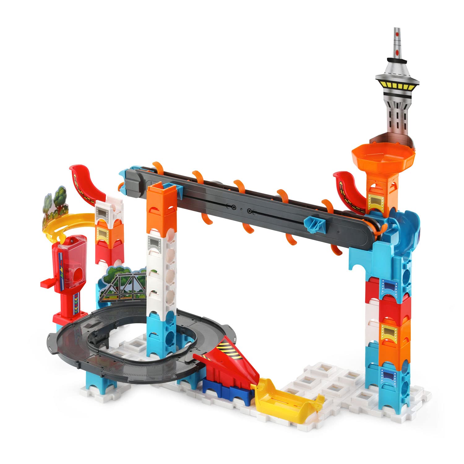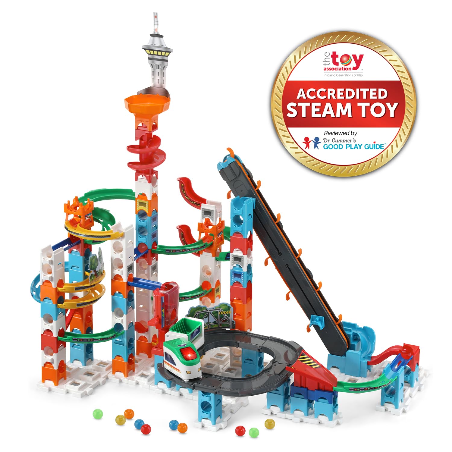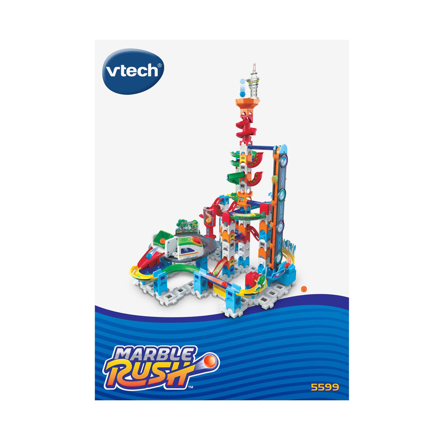 Send marbles sky high on the continuous elevator and see them plummet down ramps with the Marble Rush Sky Elevator Set. Create three thrilling builds with 153 pieces including a sky elevator, zig-zag loader, freight railway, super-fast tracks, cityscapes and marbles! Use the easy-to-follow leveled guide or create your own courses to explore STEAM (Science, Technology, Engineering, Art and Math) skills. Construct a gravity-fed course, then load the 10 colorful marbles onto the sky elevator. Hear music and sound effects as marbles are transported to the top of the playset, then dropped into the twists and turns of the course. Collect marbles in the cargo car and watch the train make the delivery. Combine with other Marble Rush sets (each sold separately) to create an extreme playset. Find more build ideas at the VTech Kids website. Recipient of the STEAM (Science, Technology, Engineering, Art and Math) Accreditation Stamp of Approval by the Toy Association. Intended for ages 4+years. Requires 6 AAA batteries. Batteries included for demo purposes only. New batteries recommended for regular use.